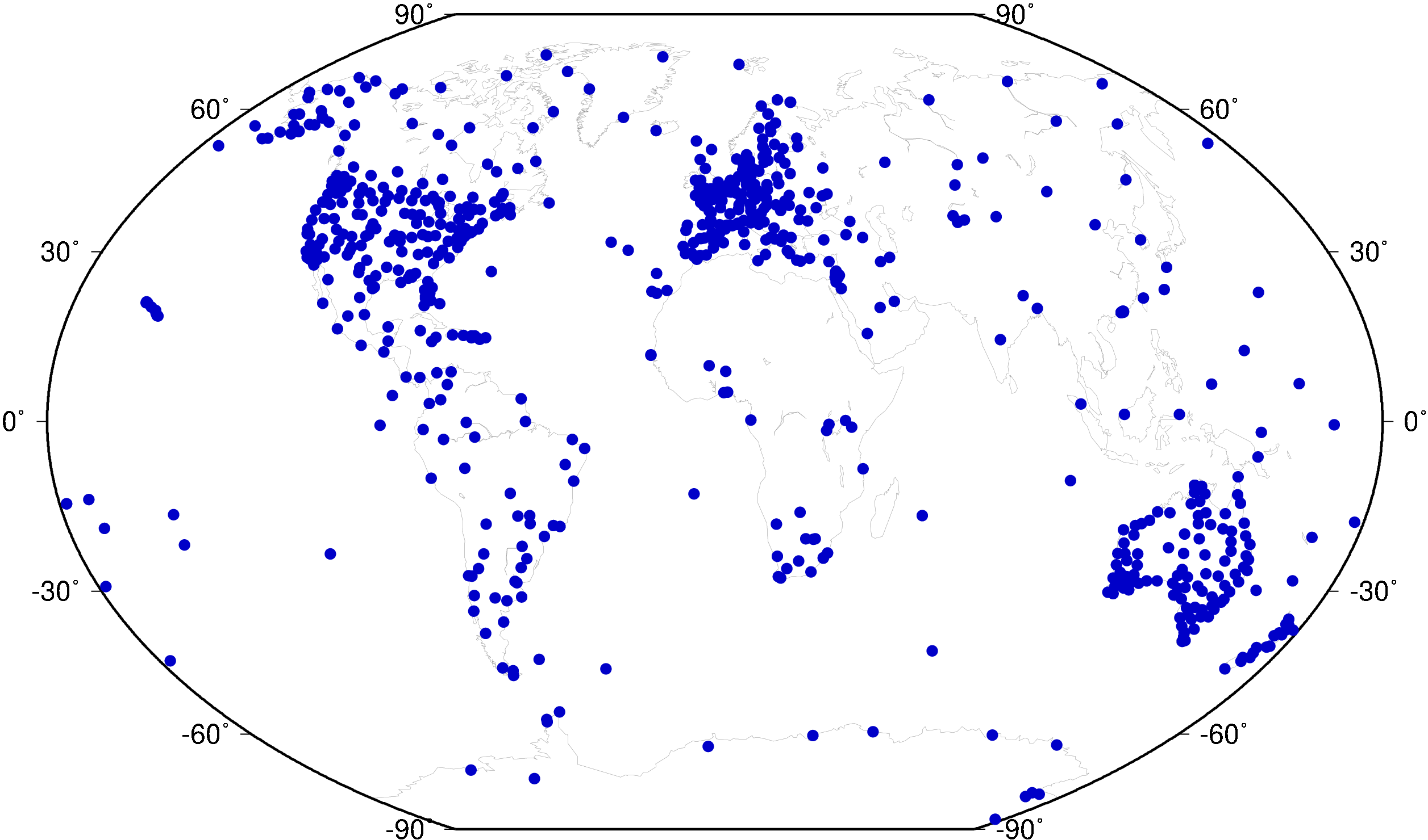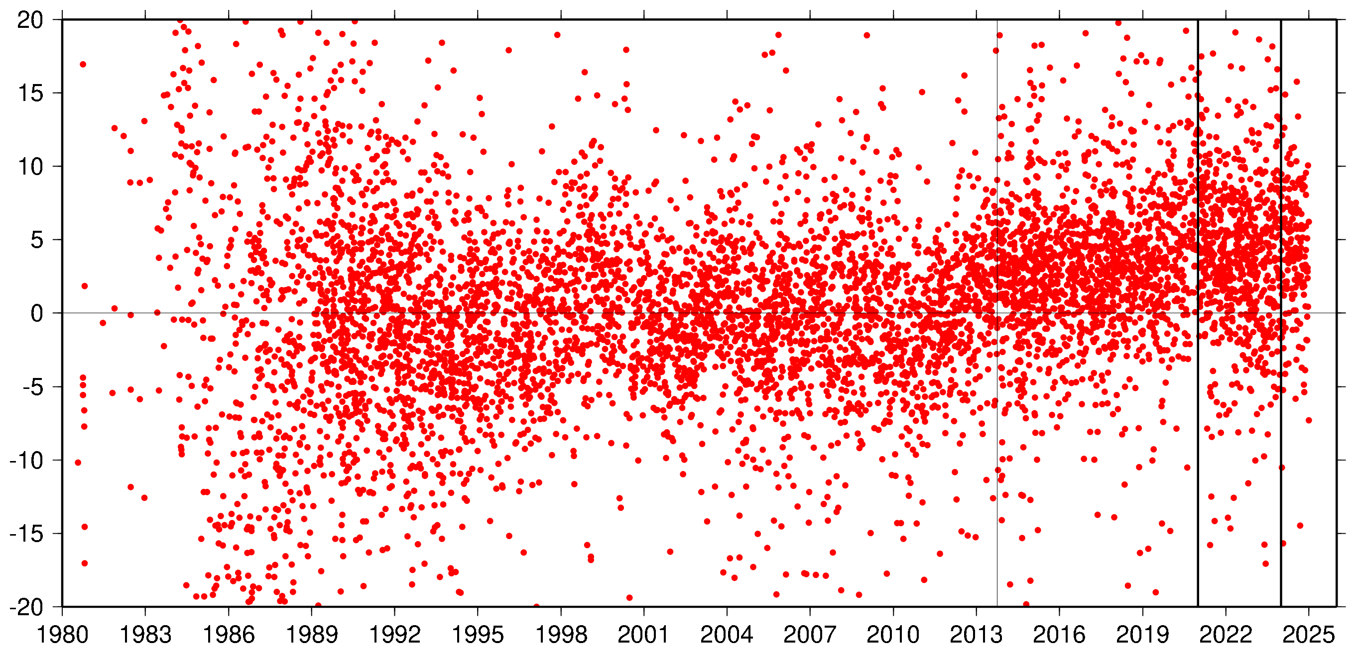 A reference network of 838 stations, whose linear coordinates and seasonal motions were hardly affected by the addition of four more years of input data, was used for the alignment of ITRF2020-u2024 to ITRF2020. See a list of these stations here and their distribution below: